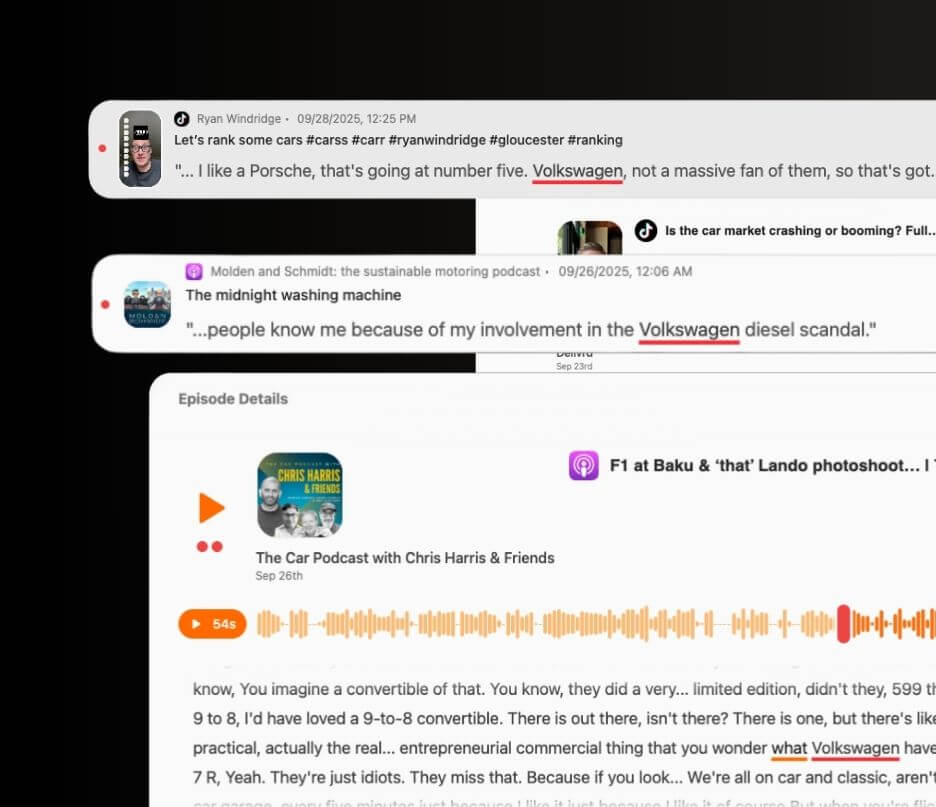 Capture dynamic insights from TikTok videos, podcasts, and voice media that traditional monitoring misses through advanced audio processing technology.