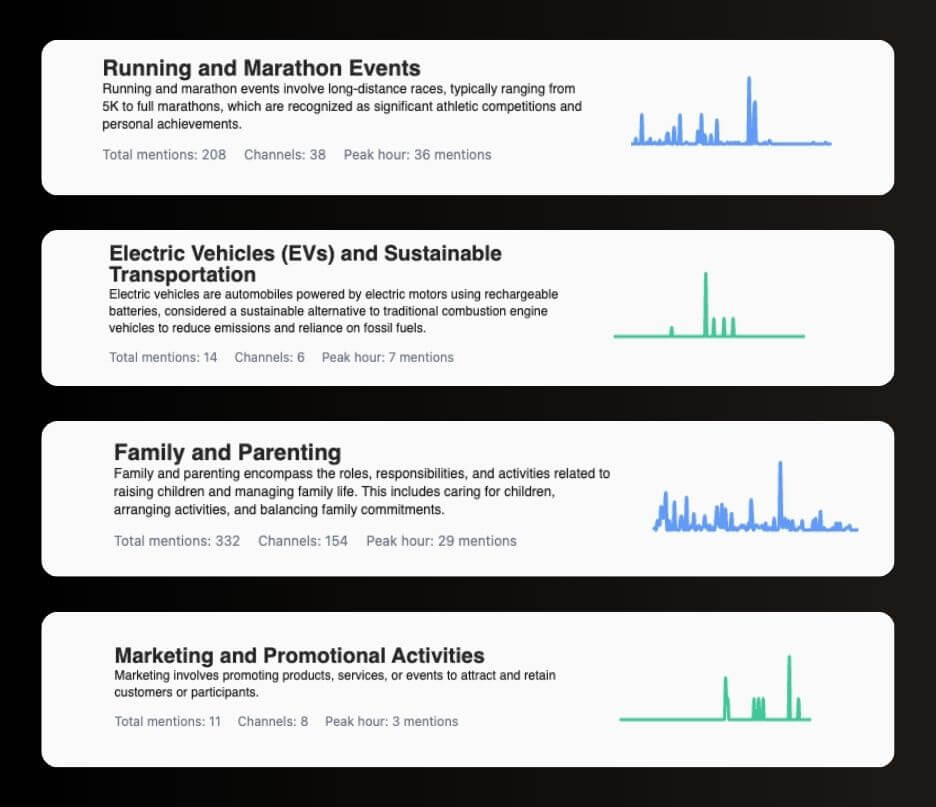 By analyzing millions of spoken conversations in social media channels, the platform automagically identifies emerging topics, trends and channels before they hit the mainstream.